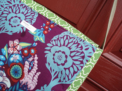 Berry Bouquet, Mezzo Messenger Bag is a medium sized messenger bag created with Denyse Schmidt's County Fair cotton canvas and Hope Valley fabrics.